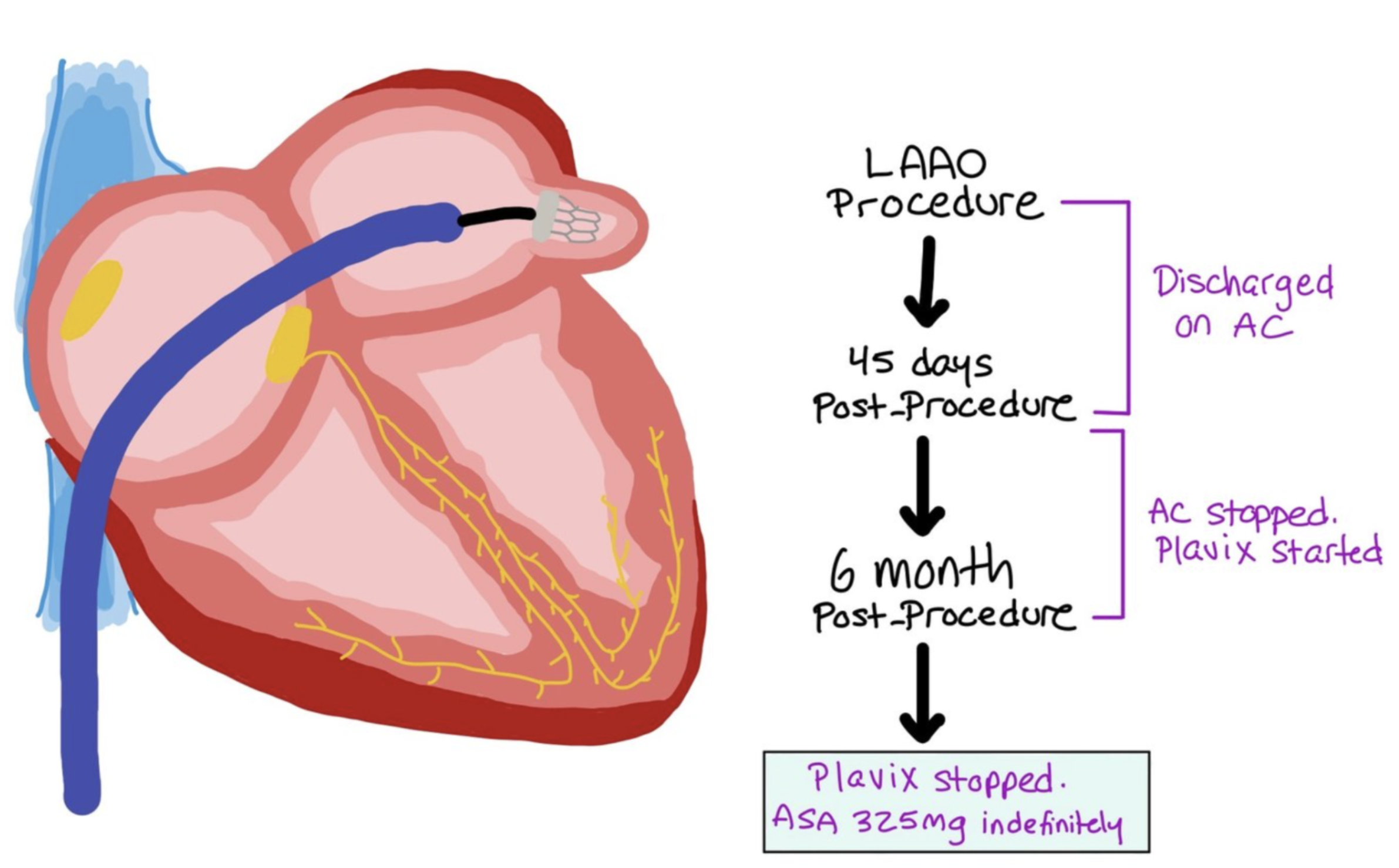 This cartoon demonstrates a patient getting a left atrial appendage device for left atrial appendage occlusion (LAAO). Ideally, these patients will ultimately be continued on aspirin monotherapy due to their high bleed risk.