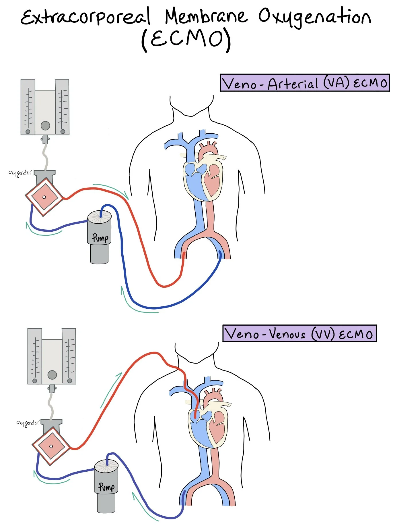 An external machine that helps remove carbon dioxide and pump oxygenated blood to the body. This picture shows a patient on Extracorporeal Membrane Oxygenation (ECMO). Patients will either get veno-arterial (VA) ECMOor veno-venous (VV) ECMO.