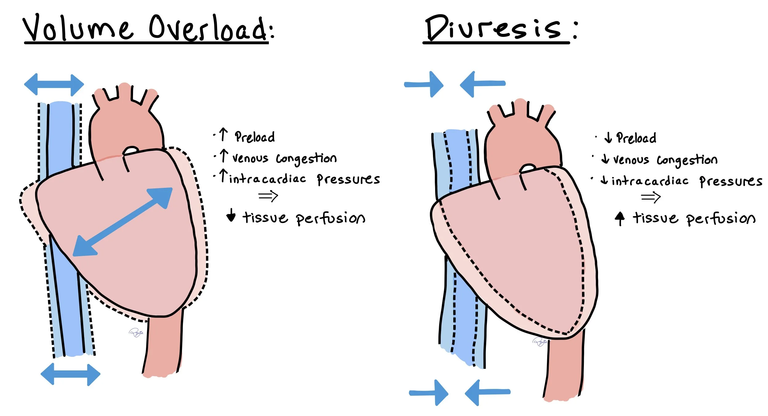 The figure above shows how increased volume in acute decompensated heart failure leads to higher preload, increased venous congestion, and increased intra-cardiac pressures. As a direct result, this leads to decreased tissue perfusion. When patients with acute decompensated heart failure receive diuresis, this will decrease preload, venous congestion, and intra-cardiac pressures, all leading to increased tissue perfusion.