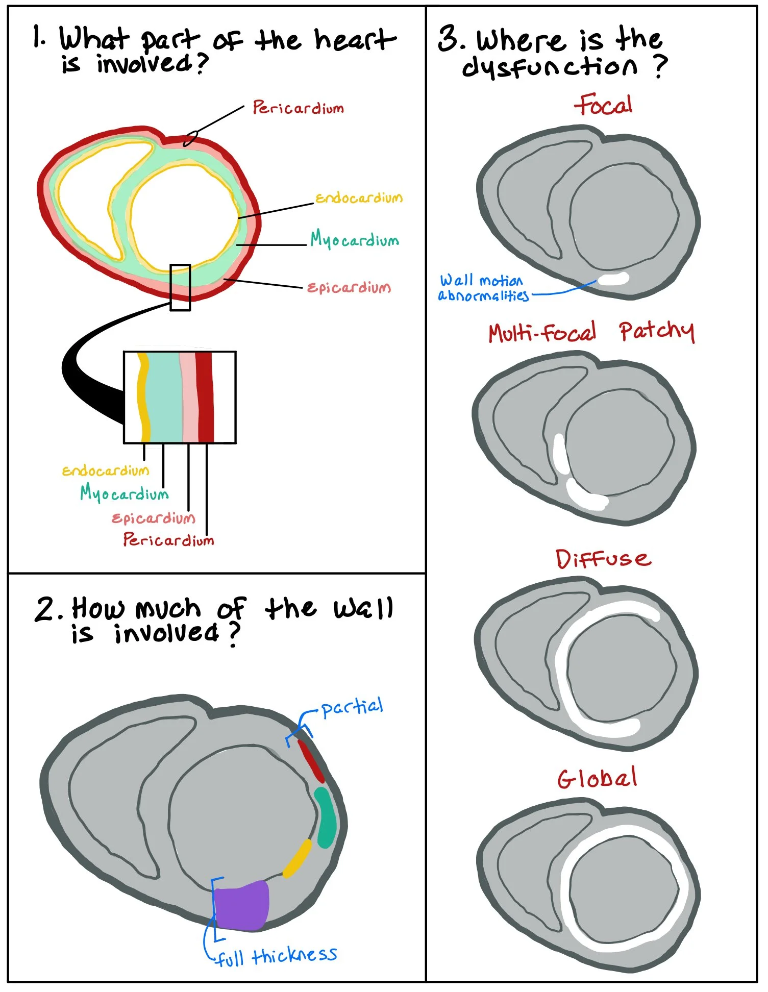 The picture above shows the different parts of the heart wall. When patients have wall motion abnormalities, we look to see how much of the wall thickness is involved (ex: normal, hypokinetic, dyskinetic, and akinetic), as well as whether the abnormality is focal or global.