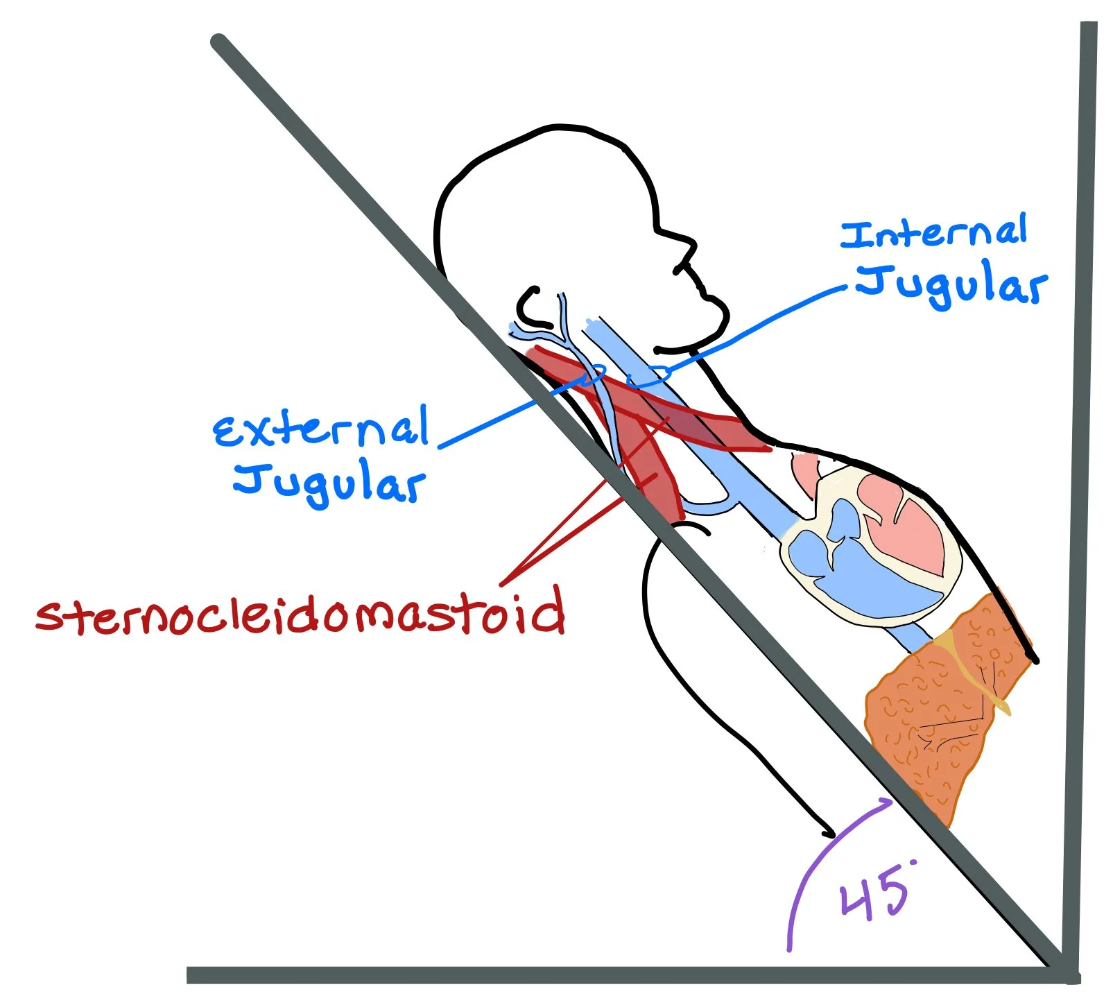 When assessing for JVD, we lay the patient back at a 45 degree angle. Usually, we expect the pulsation of the IJ to be ~3 cm over the sternal angle. The patient will then turn their head towards their left shoulder, which will help open the space between the sternocleidomastoid muscles and allow us to see the IJ.