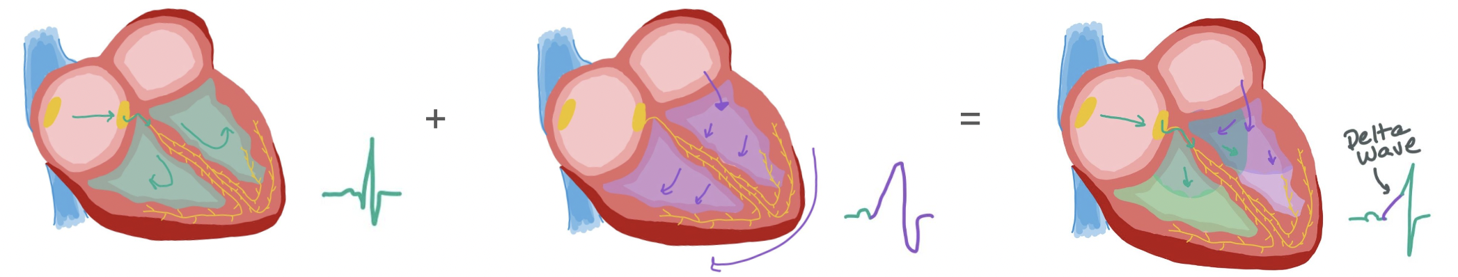 In AVRT, the accessory pathway creates the circuit that allows for the tachycardia. The accessory pathway(s) can be located on the right side, left side, or both sides of the heart. The pathway(s) can go antegrade, retrograde, or both antegrade and retrograde (as demonstrated in the figure above). The most well-known AVRT is Wolf-Parkinson White (WPW), which is famous for its delta wave that shortens the PR interval and causes slurring of the R wave. In the figure below, you can see how the combination of the normal beat (green) plus the antegrade accessory pathway (purple) combine to create the delta wave commonly seen in WPW.
